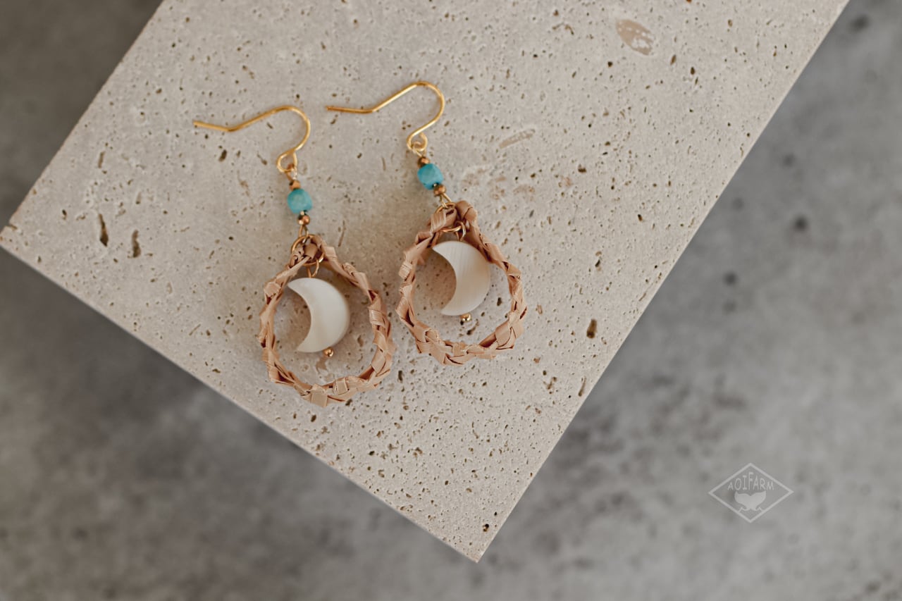 月桃と天然シェルを使った三日月形のピアスは、